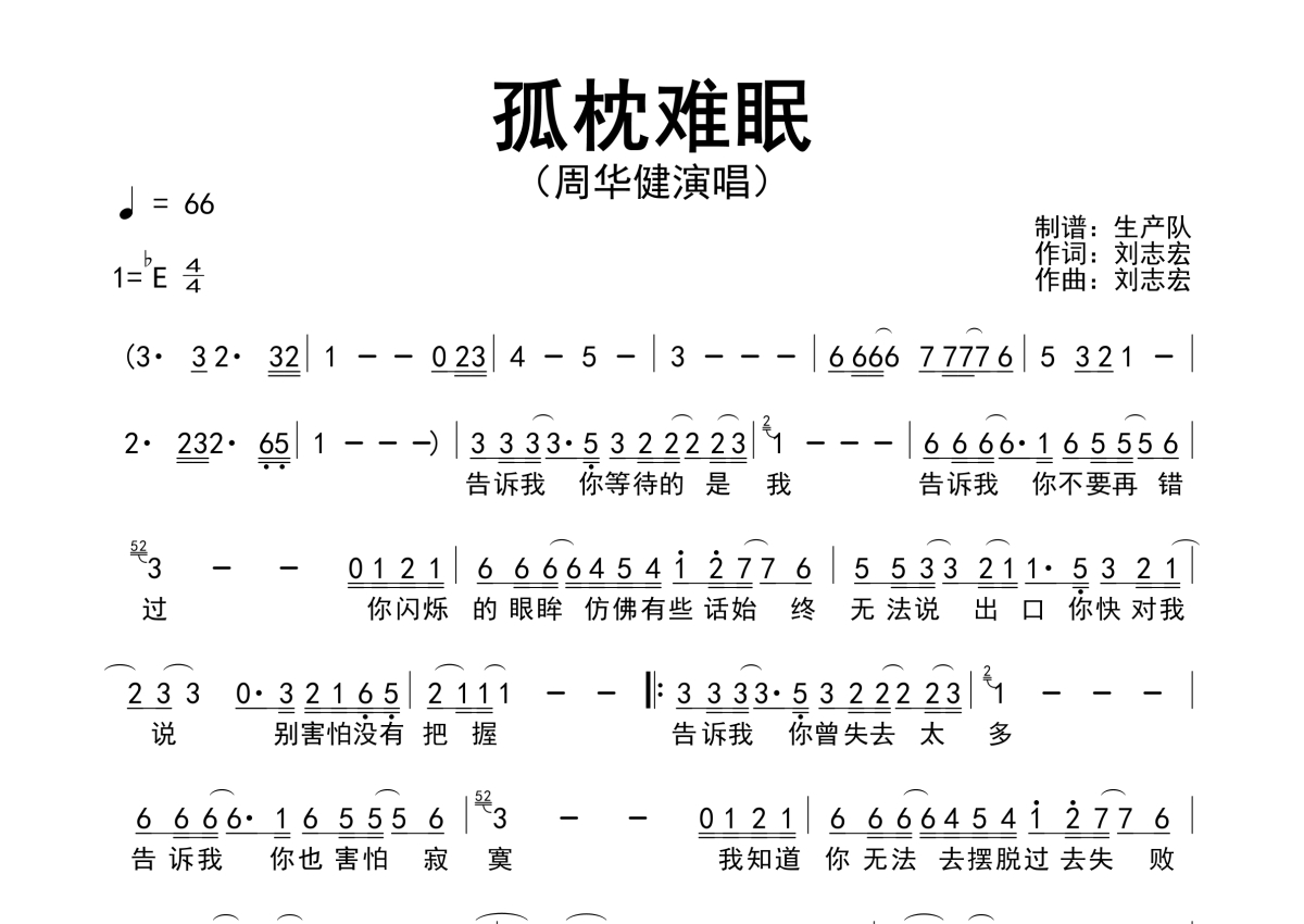 《孤枕难眠》是周华健演唱的一首歌曲,原版简谱,拍号为4/4拍,歌曲速度为每分钟66拍,这份简谱共有一张高清图谱,图谱由 @生产队 编配上传周华健演唱的经典歌曲《孤枕难眠》原版简谱。