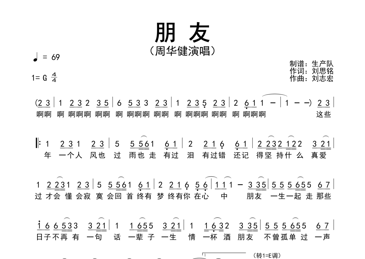 《朋友》是周华健演唱的一首歌曲,原版简谱,拍号为4/4拍,歌曲速度为每分钟69拍,这份简谱共有一张高清图谱,图谱由 @生产队 编配上传周华健演唱的经典歌曲《朋友》原版简谱。