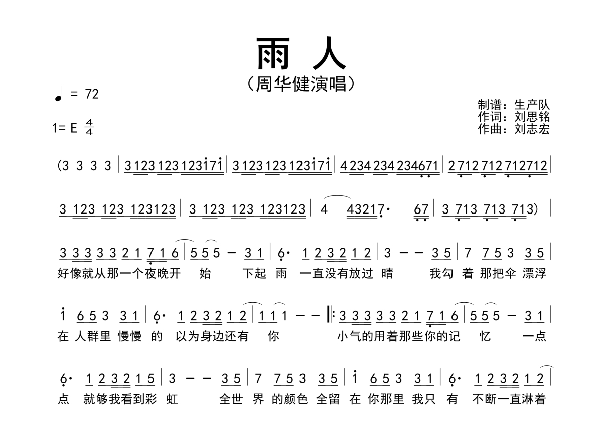 《雨人》是周华健演唱的一首歌曲,原版简谱,拍号为4/4拍,歌曲速度为每分钟72拍,这份简谱共有一张高清图谱,图谱由 @生产队 编配上传周华健演唱的经典歌曲《雨人》原版简谱。