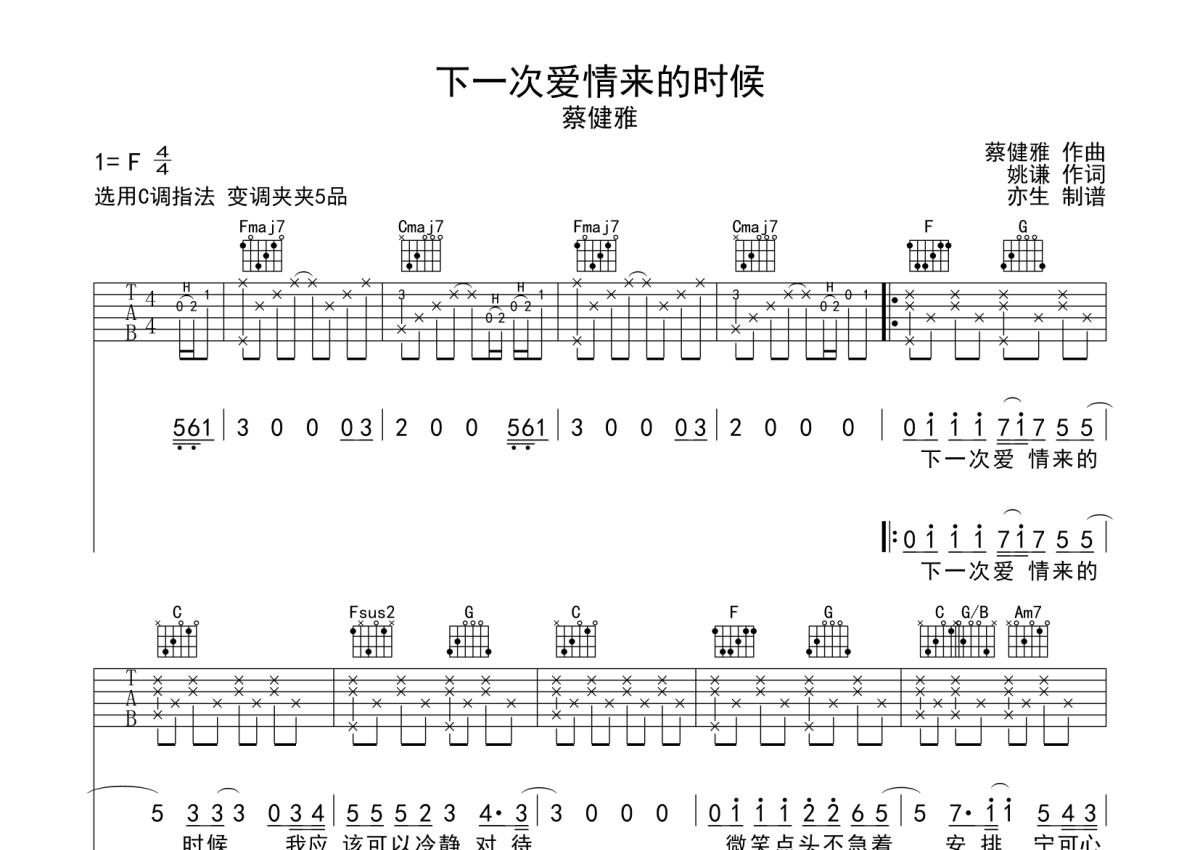 蔡健雅《下一次爱情来的时候》吉他谱 - C调弹唱六线谱