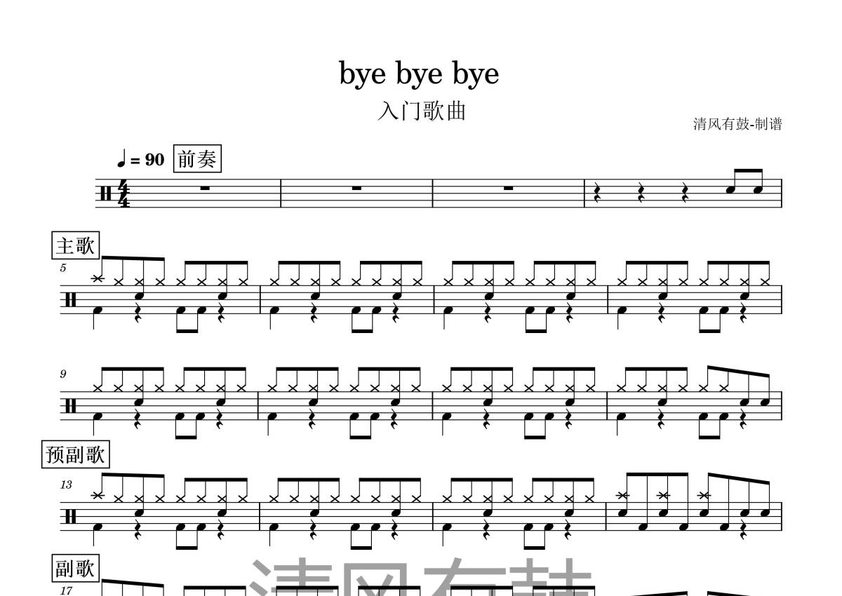 《bye bye bye》是Lovestoned演唱的一首歌曲,这份架子鼓谱共有两张高清图谱,图谱由 @清风有鼓 编配上传,图谱使用五线谱编配,使用这份bye bye bye架子鼓谱,你将能够轻松地敲打出这首Lovestoned的bye bye bye,快来尝试吧。