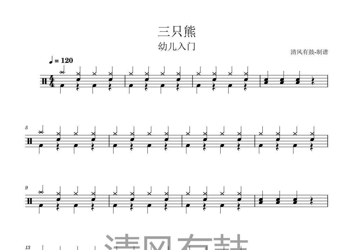 《三只熊》是儿歌演唱的一首歌曲,拍号为4/4拍,歌曲速度为每分钟120拍,这份架子鼓谱共有一张高清图谱,图谱由 @清风有鼓 编配上传,图谱使用五线谱编配,使用这份三只熊架子鼓谱,你将能够轻松地敲打出这首儿歌的三只熊,快来尝试吧。