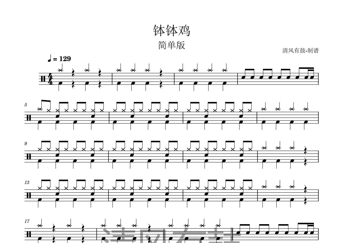 《钵钵鸡》是简单版演唱的一首歌曲,拍号为4/4拍,歌曲速度为每分钟129拍,这份架子鼓谱共有两张高清图谱,图谱由 @清风有鼓 编配上传,图谱使用五线谱编配,使用这份钵钵鸡架子鼓谱,你将能够轻松地敲打出这首简单版的钵钵鸡,快来尝试吧。