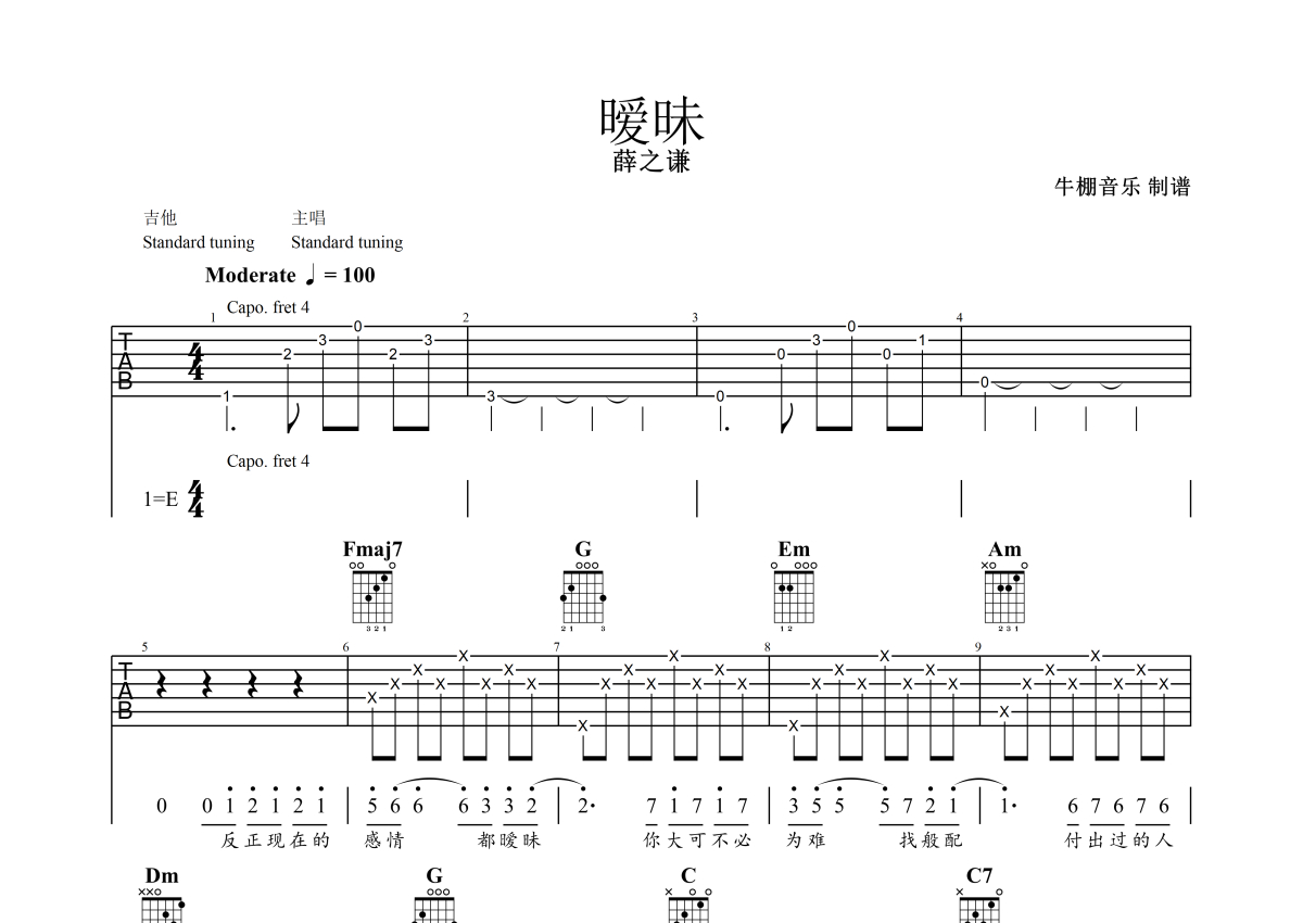 《暧昧》是薛之谦演唱的一首歌曲,拍号为4/4拍,歌曲速度为每分钟100拍,歌曲原调为E调,但由于原调指法比较难,为了方便弹奏,本吉他谱采用的是C调指法编配,变调夹4品弹奏即为原调,当然也可以根据自己的音域改变变调夹位置,或者通过改变和弦调性,以方便自己弹奏,这份吉他谱共有五张高清图谱,图谱由 @牛棚音乐 编配上传,图谱使用六线谱编配,包含吉他和弦指法、简谱以及歌词部分,曲谱配备了相关的音频提供试听,使用这份暧昧吉他谱,可以让你更加方便地掌握这首歌曲的弹唱技巧,快来尝试吧。薛之谦演唱的《暧昧》,原调E调,用C调指法演奏,变调夹4品,适合初学者,试听后合适再选择,附件还有高清无水印曲谱。
