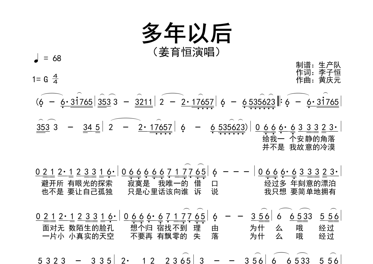 《多年以后》是姜育恒演唱的一首歌曲,原版简谱,拍号为4/4拍,歌曲速度为每分钟68拍,这份简谱共有一张高清图谱,图谱由 @生产队 编配上传姜育恒演唱的经典歌曲《多年以后》原版简谱。