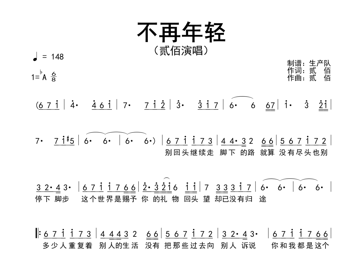 《不再年轻》是贰佰演唱的一首歌曲,原版简谱,拍号为6/8拍,歌曲速度为每分钟148拍,这份简谱共有一张高清图谱,图谱由 @生产队 编配上传贰佰演唱的民谣歌曲《不再年轻》原版简谱。