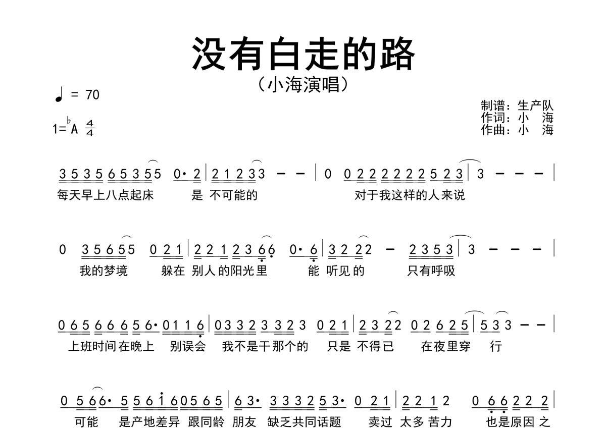 《没有白走的路》是小海演唱的一首歌曲,原版简谱,拍号为4/4拍,歌曲速度为每分钟70拍,这份简谱共有两张高清图谱,图谱由 @生产队 编配上传小海演唱的民谣歌曲《没有白走的路》原版简谱。