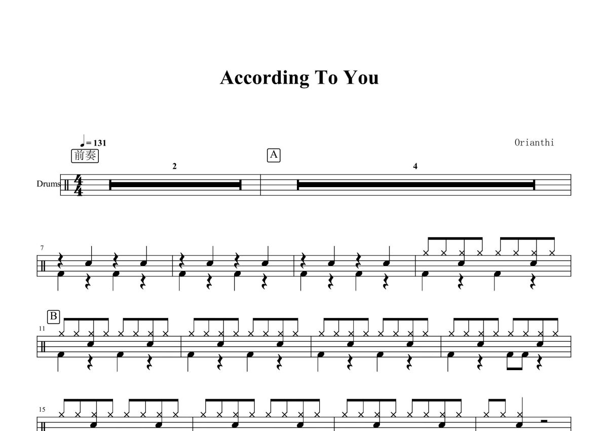 《According To You》是Orianthi演唱的一首歌曲,这份鼓谱共有三张高清图谱,图谱由 @打鼓谱 编配上传,图谱使用五线谱编配,使用这份According To You架子鼓谱,你将能够轻松地敲打出这首Orianthi的According To You,快来尝试吧。《According To You》是Orianthi演唱的一首歌曲,收录在2009年的专辑《Believe》中。Orianthi于1985年1月22日出生南澳的Adelaide,在她6岁的时候就开始弹木吉他,直到她15岁离开校园后,开始把焦点聚集在写歌及表演上头。在她18岁时机缘遇见心目中的偶像Carlos Santana,并受邀同台演出,这是相当珍贵的经验。