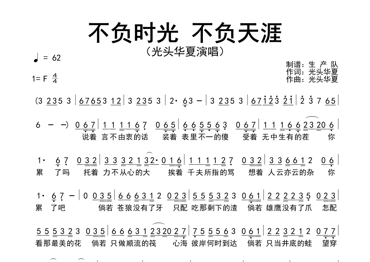 《不负时光不负天涯》是光头华夏演唱的一首歌曲,原版简谱,拍号为4/4拍,歌曲速度为每分钟62拍,这份简谱共有一张高清图谱,图谱由 @生产队 编配上传光头华夏演唱的民谣歌曲《不负时光不负天涯》原版简谱。