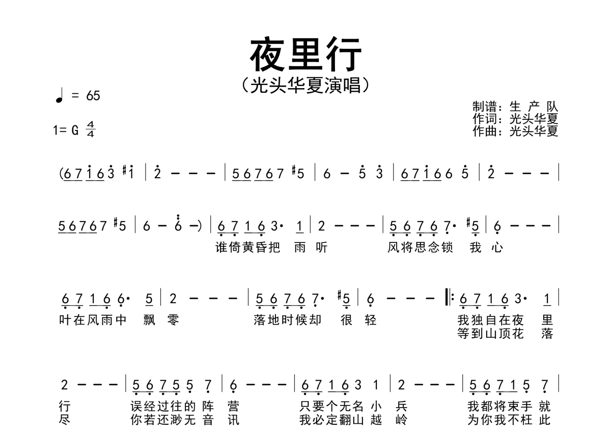 光头华夏《夜里行》简谱 - 原版简谱