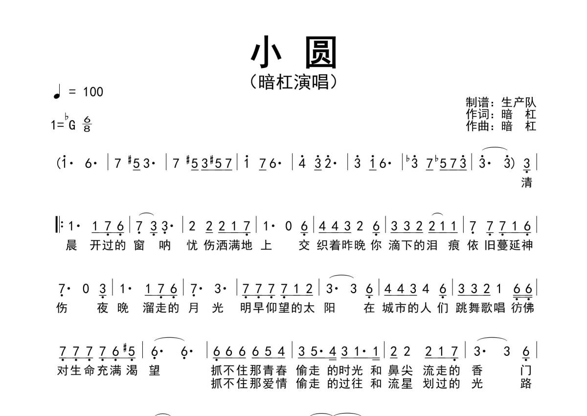 《小圆》是暗杠演唱的一首歌曲,原版简谱,拍号为6/8拍,歌曲速度为每分钟100拍,这份简谱共有一张高清图谱,图谱由 @生产队 编配上传暗杠演唱的民谣歌曲《小圆》原版简谱。