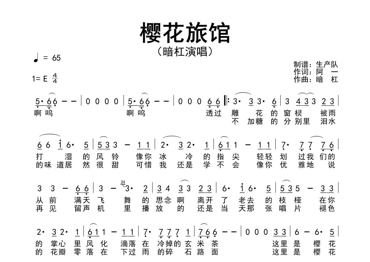 《樱花旅馆》是暗杠演唱的一首歌曲,原版简谱,拍号为4/4拍,歌曲速度为每分钟65拍,这份简谱共有一张高清图谱,图谱由 @生产队 编配上传暗杠演唱的民谣歌曲《樱花旅馆》原版简谱。