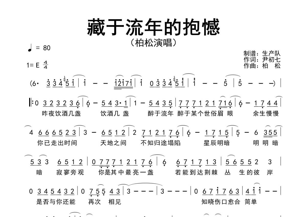 《藏于流年的抱憾》是柏松演唱的一首歌曲,原版简谱,拍号为4/4拍,歌曲速度为每分钟80拍,这份简谱共有一张高清图谱,图谱由 @生产队 编配上传柏松演唱的民谣歌曲《藏于流年的抱憾》原版简谱。