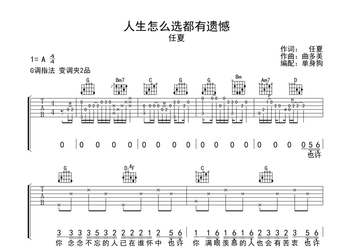 任夏《人生怎么选都有遗憾》吉他谱 - G调弹唱六线谱