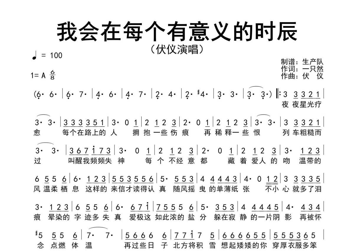 《我会在每个有意义的时辰》是伏仪演唱的一首歌曲,原版简谱,拍号为6/8拍,歌曲速度为每分钟100拍,这份简谱共有一张高清图谱,图谱由 @生产队 编配上传伏仪演唱的民谣歌曲《我会在每个有意义的时辰》原版简谱。