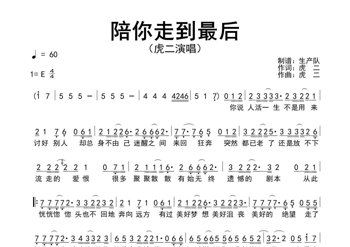 《陪你走到最后》是虎二演唱的一首歌曲,原版简谱,拍号为4/4拍,歌曲速度为每分钟60拍,这份简谱共有一张高清图谱,图谱由 @生产队 编配上传虎二演唱的经典歌曲《陪你走到最后》原版简谱,准确的前奏,间奏solo编配。