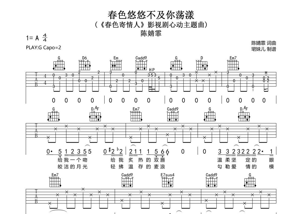陈婧霏《春色悠悠不及你荡漾》吉他谱 - G调弹唱六线谱