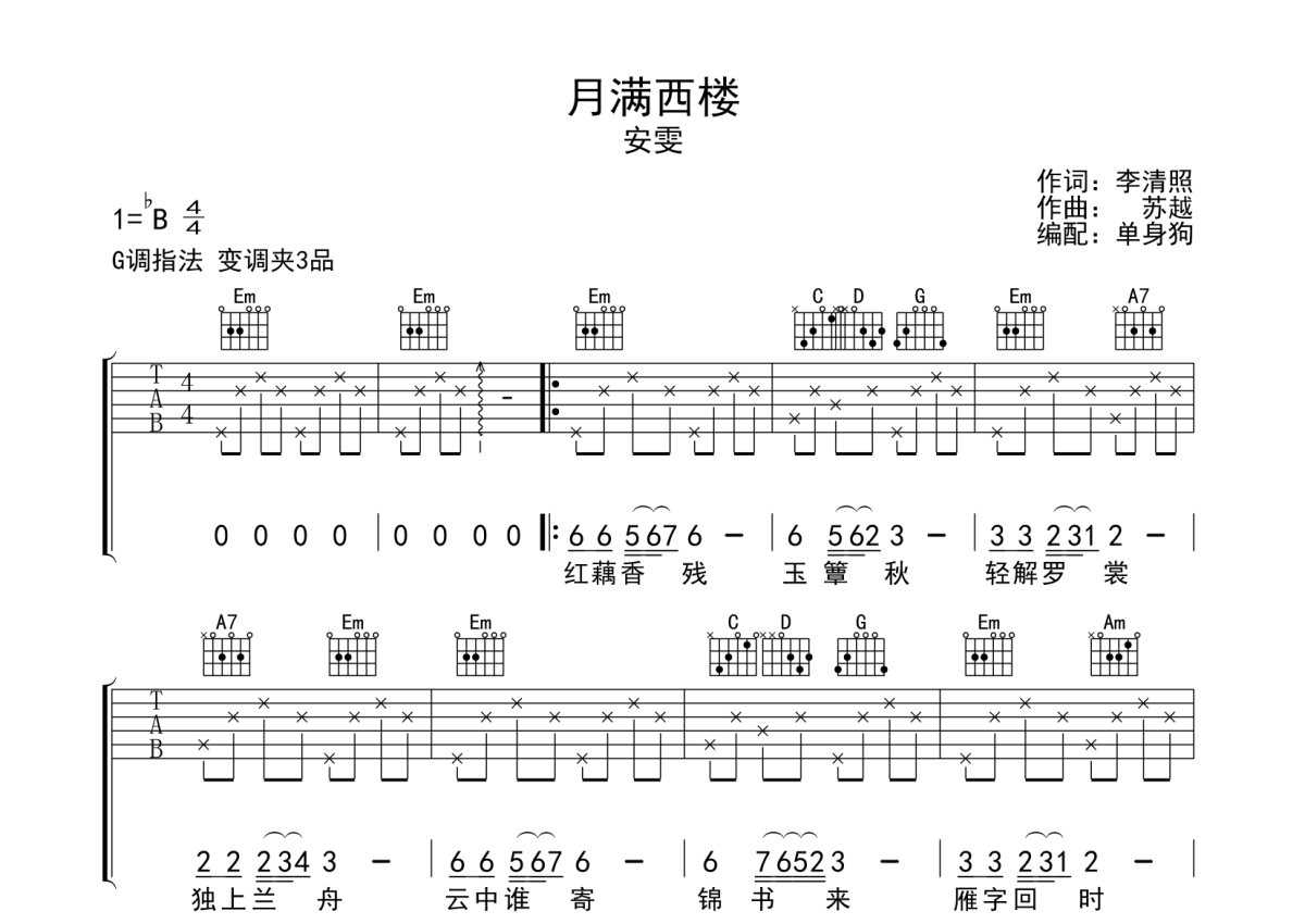 月满西楼吉他谱 - 安雯 - G调弹唱六线谱