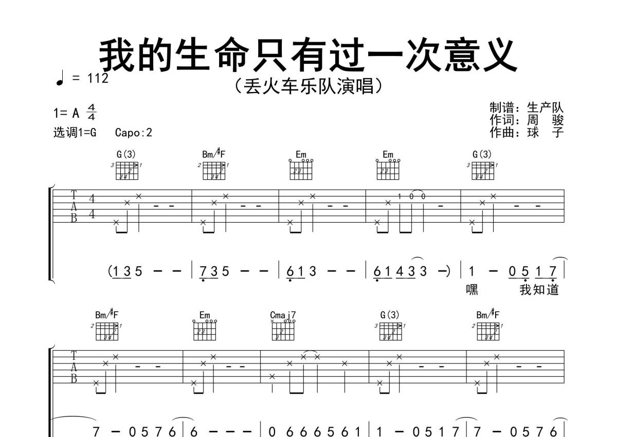 《我的生命只有过一次意义》是丢火车乐队演唱的一首歌曲,精编完美版,拍号为4/4拍,歌曲速度为每分钟112拍,歌曲原调为A调,但由于原调指法比较难,为了方便弹奏,本吉他谱采用的是G调指法编配,变调夹2品弹奏即为原调,当然也可以根据自己的音域改变变调夹位置,或者通过改变和弦调性,以方便自己弹奏,这份吉他谱共有四张高清图谱,图谱由 @生产队 编配上传,图谱使用六线谱编配,包含吉他和弦指法、简谱以及歌词部分,使用这份我的生命只有过一次意义吉他谱,可以让你更加方便地掌握这首歌曲的弹唱技巧,快来尝试吧。《我的生命只有过一次意义》是歌手丢火车演唱的一首歌曲,由球子作词,球子作曲,收录于专辑《我的生命只有过一次意义》中。本吉他谱根据原版G调指法编配,完整的前奏、间奏和SOLO编配,精编完美版,值得推荐!。