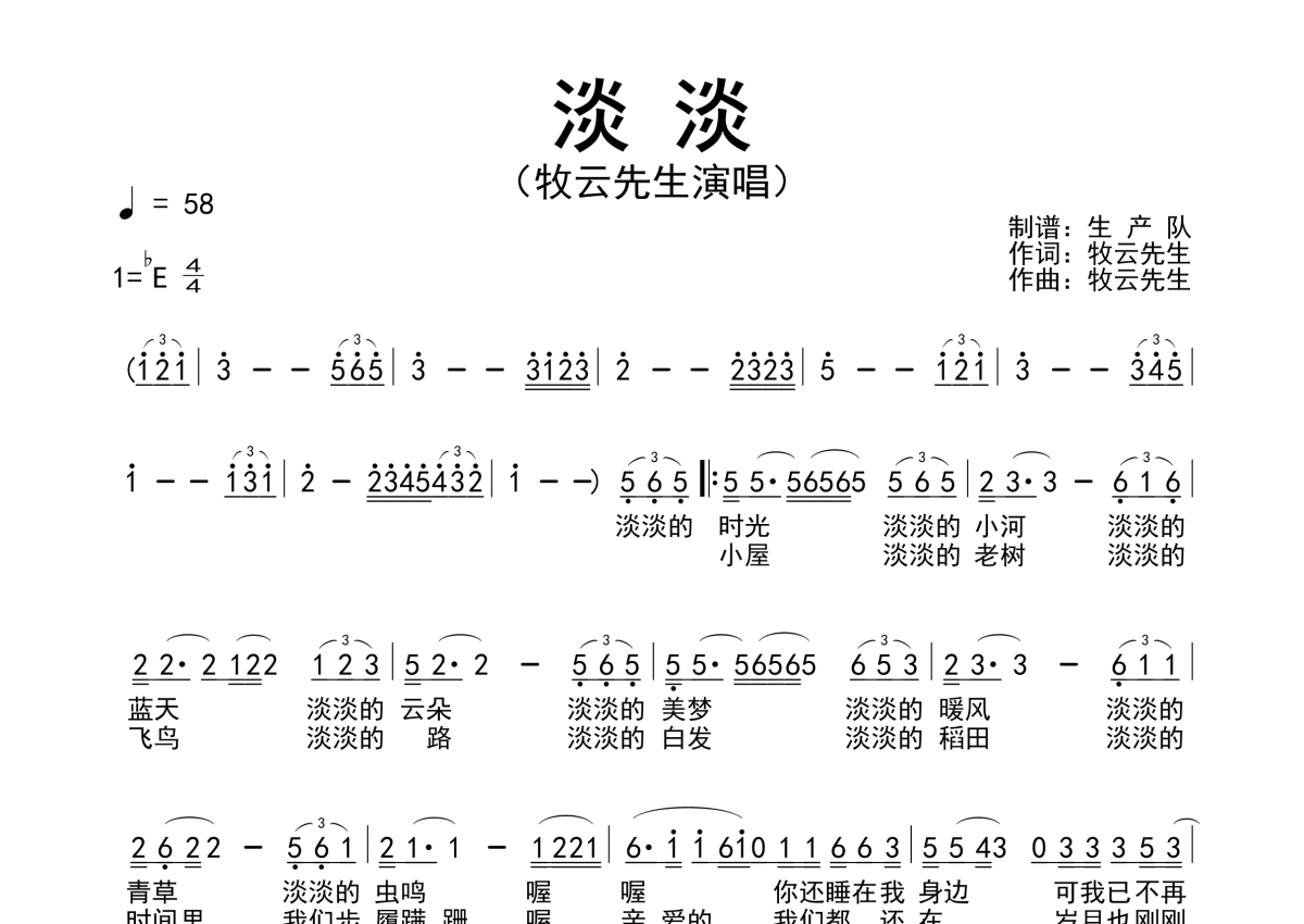 《淡淡》是牧云先生演唱的一首歌曲,原版简谱,拍号为4/4拍,歌曲速度为每分钟58拍,这份简谱共有一张高清图谱,图谱由 @生产队 编配上传牧云先生演唱的歌曲《淡淡》原版简谱,完整的前奏、间奏、尾奏和solo编配。