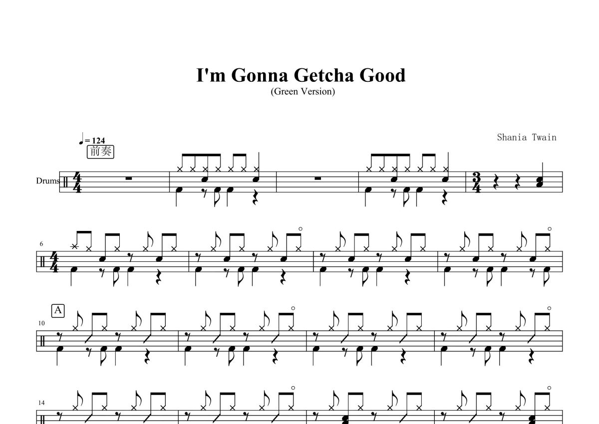 《i'm gonna getcha good》是Shania Twain演唱的一首歌曲,这份鼓谱共有五张高清图谱,图谱由 @打鼓谱 编配上传,图谱使用五线谱编配,使用这份i'm gonna getcha good架子鼓谱,你将能够轻松地敲打出这首Shania Twain的i'm gonna getcha good,快来尝试吧。《i'm gonna getcha good》是一首歌曲,演唱者是Shania Twain,2002年推出。仙妮亚·唐恩(Shania Twain),1965年8月28日出生于加拿大安大略省,加拿大乡村音乐女歌手。