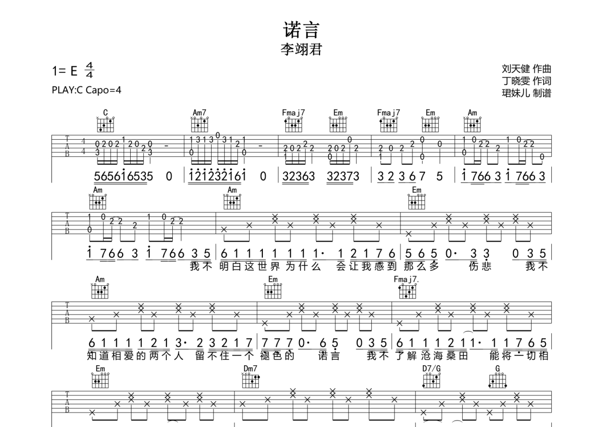 《诺言》是李翊君演唱的一首歌曲,拍号为4/4拍,歌曲速度为每分钟85拍,歌曲原调为E调,但由于原调指法比较难,为了方便弹奏,本吉他谱采用的是C调指法编配,变调夹4品弹奏即为原调,当然也可以根据自己的音域改变变调夹位置,或者通过改变和弦调性,以方便自己弹奏,这份吉他谱共有两张高清图谱,图谱由 @珺妹儿 编配上传,图谱使用六线谱编配,包含吉他和弦指法、简谱以及歌词部分,使用这份诺言吉他谱,可以让你更加方便地掌握这首歌曲的弹唱技巧,快来尝试吧。