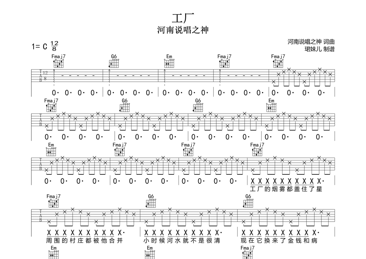 工厂吉他谱 - 河南说唱之神 - C调弹唱六线谱