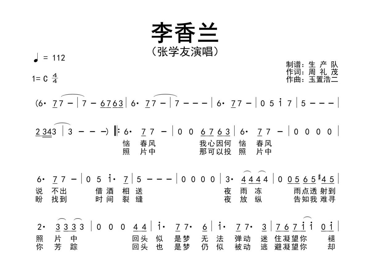 《李香兰》是张学友演唱的一首歌曲,原版简谱,拍号为4/4拍,歌曲速度为每分钟112拍,这份简谱共有一张高清图谱,图谱由 @生产队 编配上传张学友演唱的经典歌曲《李香兰》原版简谱。