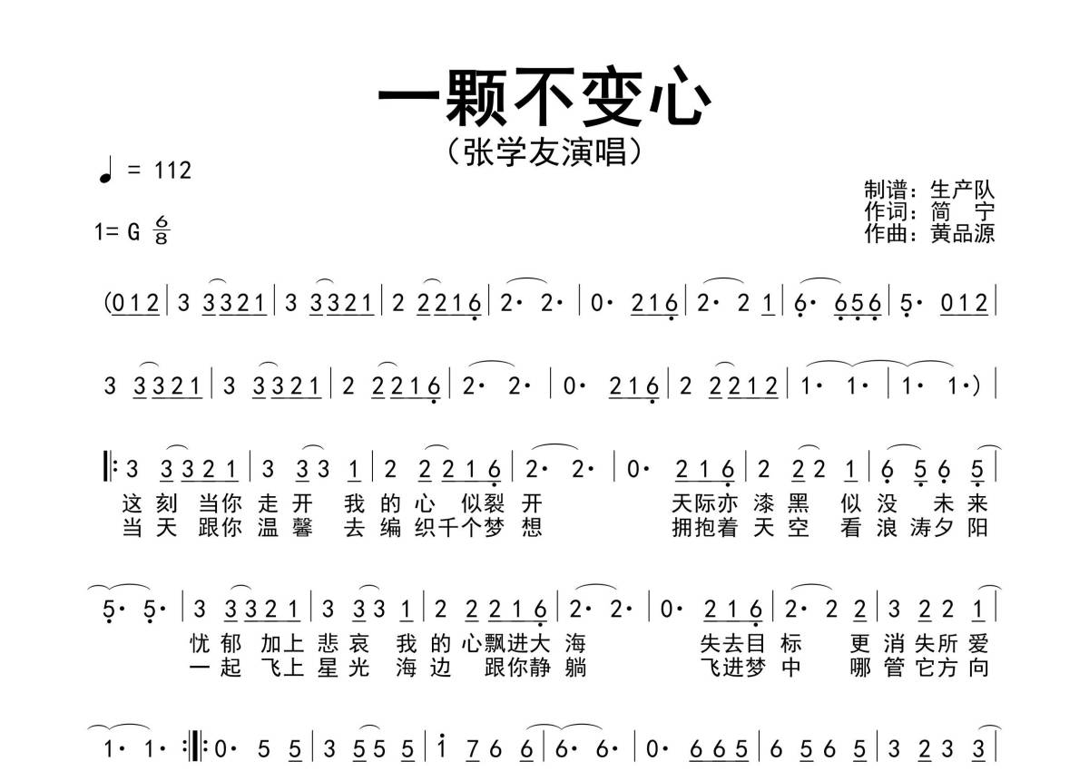 《一颗不变心》是张学友演唱的一首歌曲,原版简谱,拍号为6/8拍,歌曲速度为每分钟112拍,这份简谱共有一张高清图谱,图谱由 @生产队 编配上传张学友演唱的经典歌曲《一颗不变心》原版简谱。