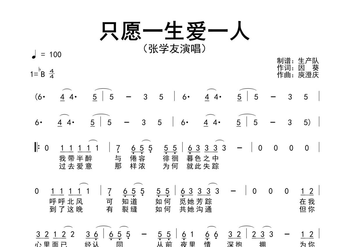 《只愿一生爱一人》是张学友演唱的一首歌曲,原版简谱,拍号为4/4拍,歌曲速度为每分钟100拍,这份简谱共有一张高清图谱,图谱由 @生产队 编配上传张学友演唱的经典歌曲《只愿一生爱一人》原版简谱。