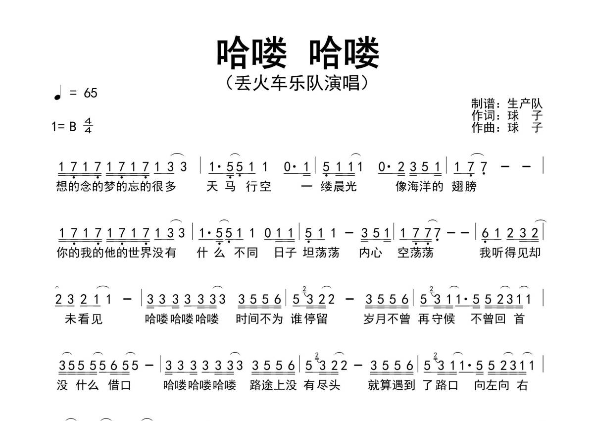 《哈喽 哈喽》是丢火车乐队演唱的一首歌曲,原版简谱,拍号为4/4拍,歌曲速度为每分钟65拍,这份简谱共有一张高清图谱,图谱由 @生产队 编配上传丢火车乐队演唱的歌曲《哈喽 哈喽》原版简谱。
