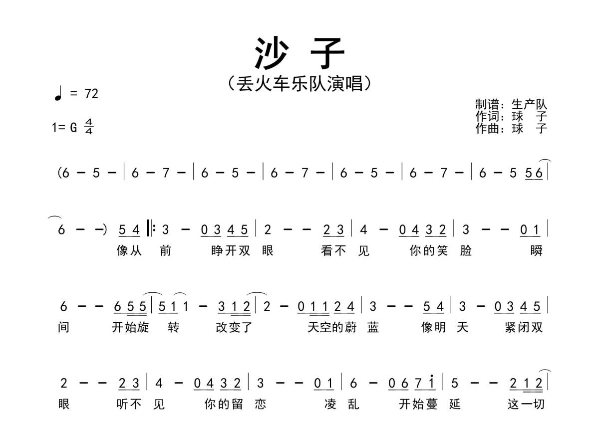 《沙子》是丢火车乐队演唱的一首歌曲,原版简谱,拍号为4/4拍,歌曲速度为每分钟72拍,这份简谱共有两张高清图谱,图谱由 @生产队 编配上传丢火车乐队演唱的歌曲《沙子》原版简谱,精准的前奏、间奏和solo编配!。