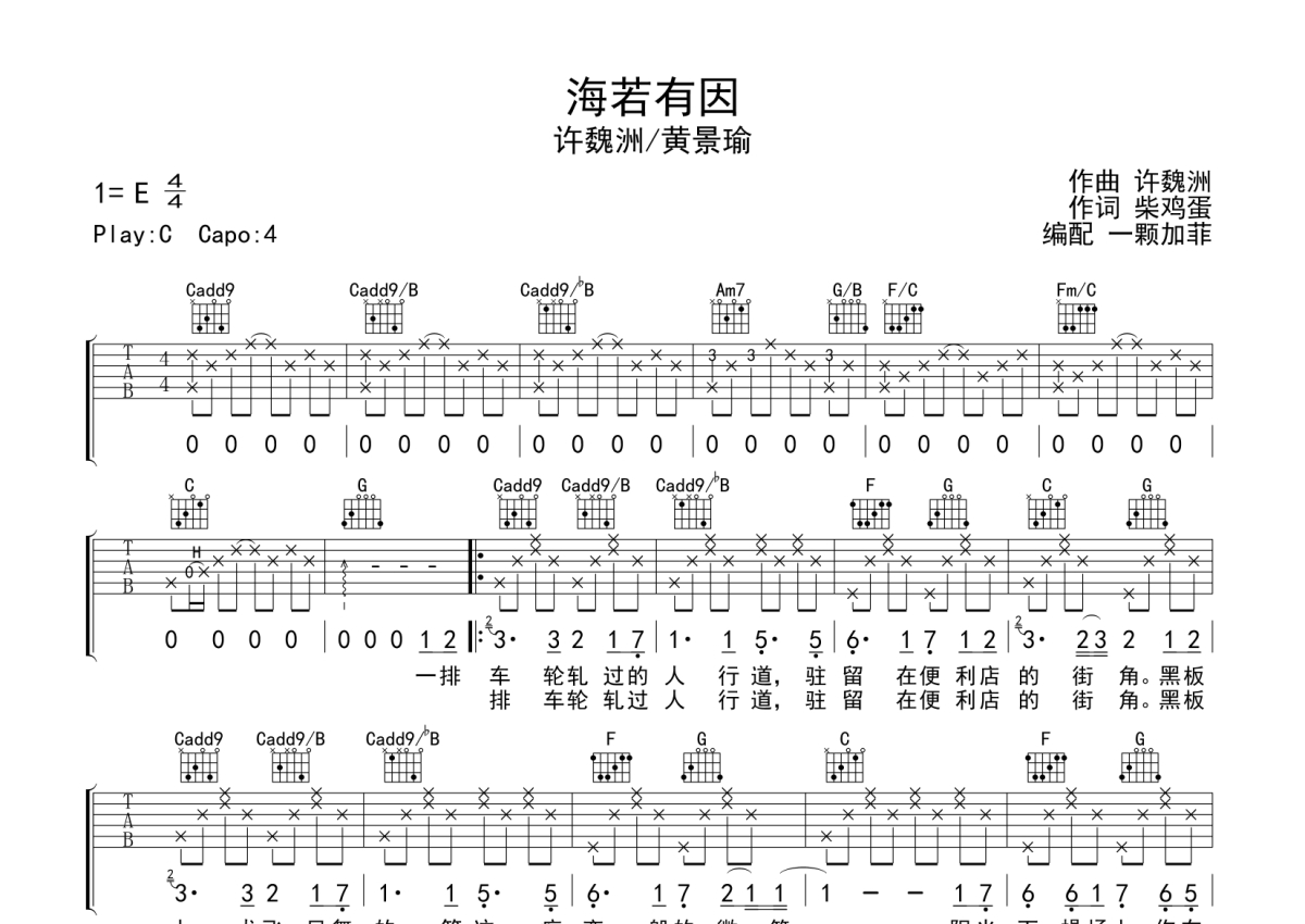 《海若有因》是许魏洲/黄景瑜演唱的一首歌曲,拍号为4/4拍,歌曲原调为E调,但由于原调指法比较难,为了方便弹奏,本吉他谱采用的是C调指法编配,变调夹4品弹奏即为原调,当然也可以根据自己的音域改变变调夹位置,或者通过改变和弦调性,以方便自己弹奏,这份吉他谱共有两张高清图谱,图谱由 @一颗加菲 编配上传,图谱使用六线谱编配,包含吉他和弦指法、简谱以及歌词部分,曲谱配备了相关的音频提供试听,使用这份海若有因吉他谱,可以让你更加方便地掌握这首歌曲的弹唱技巧,快来尝试吧。