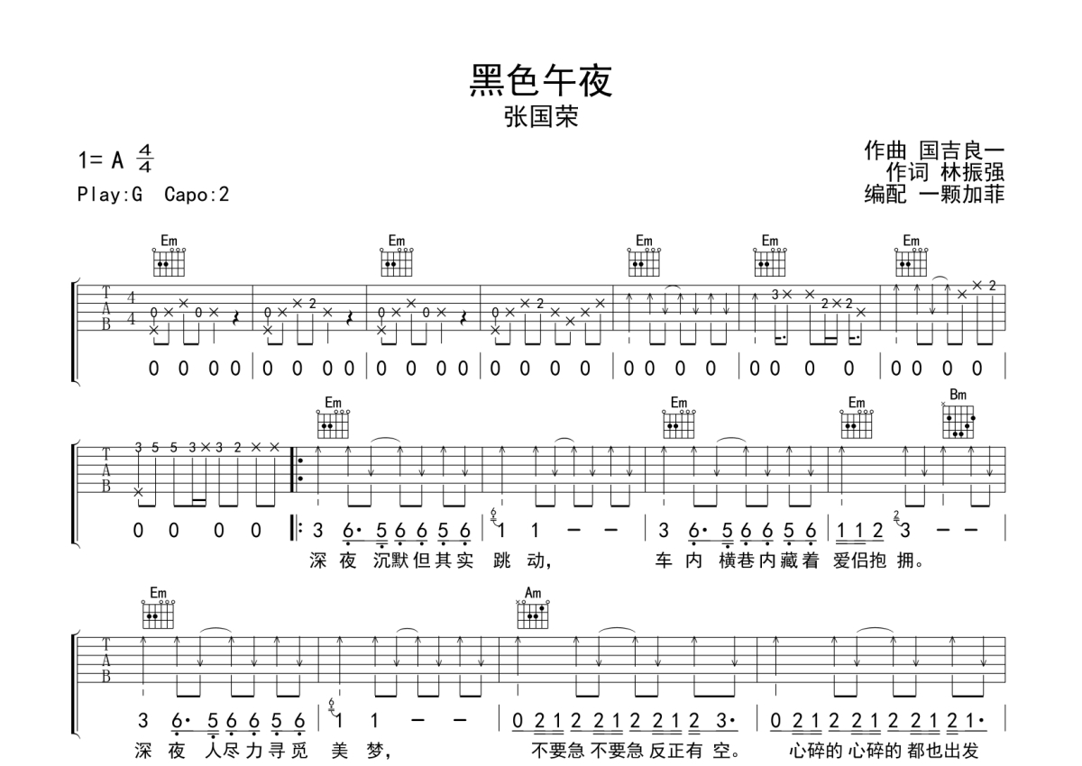《黑色午夜》是张国荣演唱的一首歌曲,拍号为4/4拍,歌曲原调为A调,但由于原调指法比较难,为了方便弹奏,本吉他谱采用的是G调指法编配,变调夹2品弹奏即为原调,当然也可以根据自己的音域改变变调夹位置,或者通过改变和弦调性,以方便自己弹奏,这份吉他谱共有两张高清图谱,图谱由 @一颗加菲 编配上传,图谱使用六线谱编配,包含吉他和弦指法、简谱以及歌词部分,曲谱配备了相关的音频提供试听,使用这份黑色午夜吉他谱,可以让你更加方便地掌握这首歌曲的弹唱技巧,快来尝试吧。