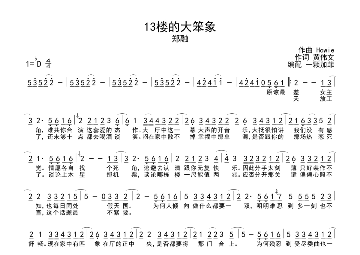 《13楼的大笨象》是郑融演唱的一首歌曲,这份简谱共有一张高清图谱,图谱由 @一颗加菲 编配上传。