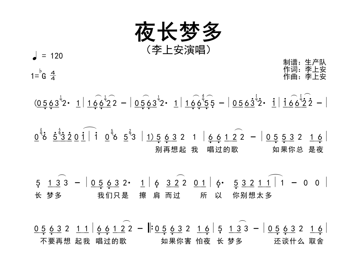 李上安《夜长梦多》简谱 - 原版简谱