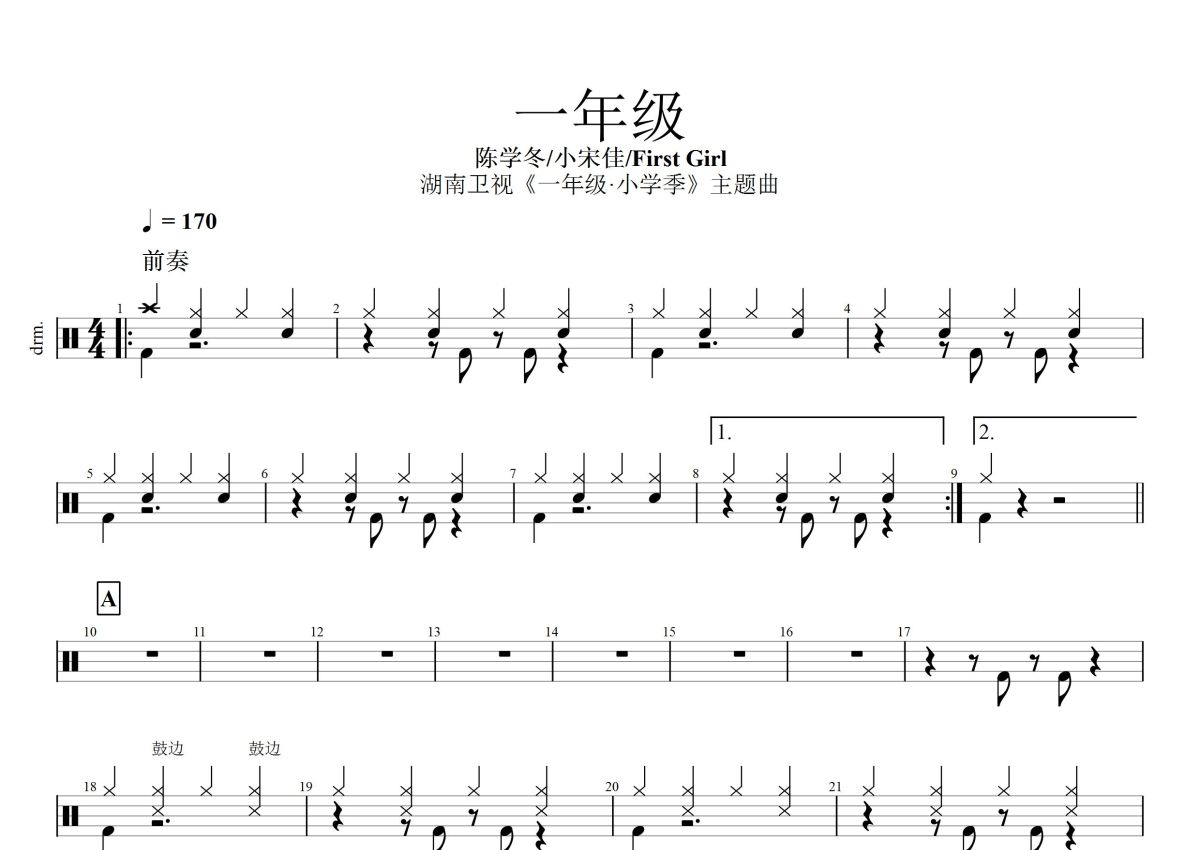 陈学冬/小宋佳/First Girl《一年级》鼓谱 - 架子鼓谱