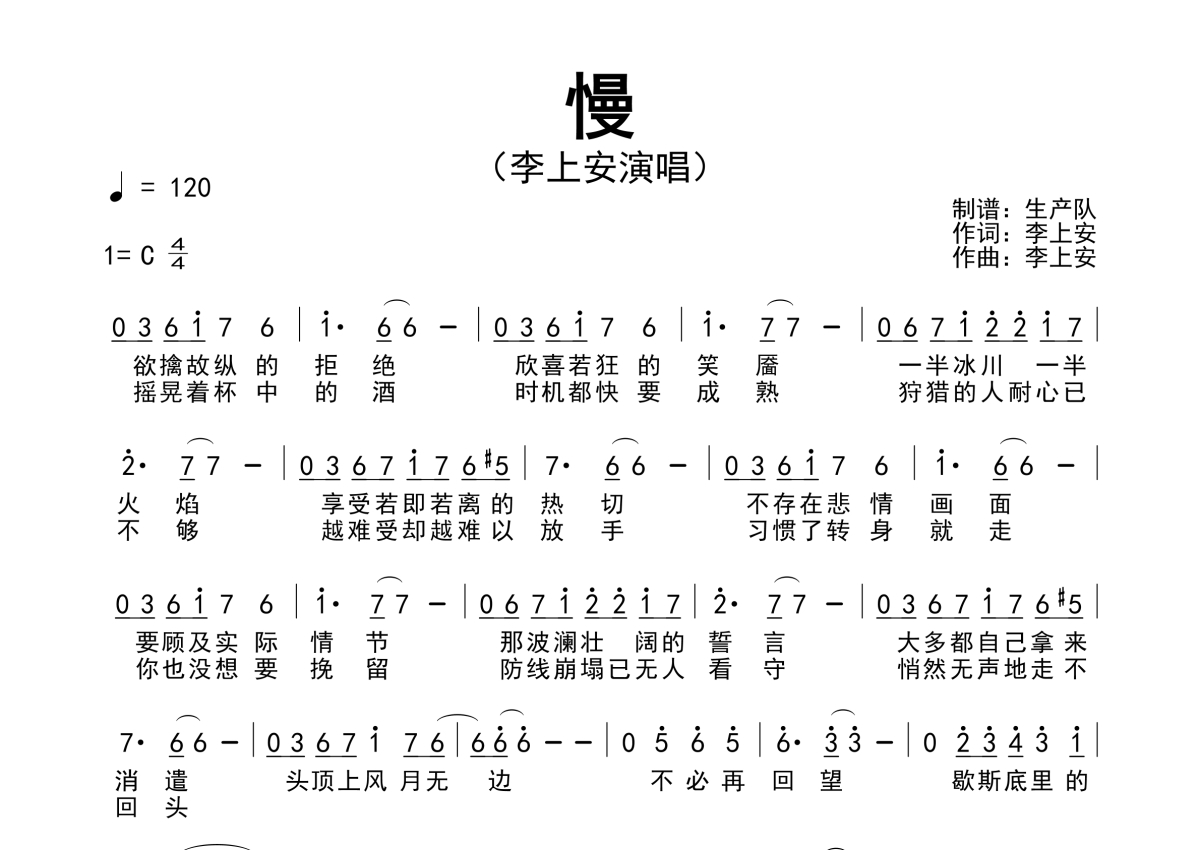 《慢》是李上安演唱的一首歌曲,原版简谱,拍号为4/4拍,歌曲速度为每分钟120拍,这份简谱共有一张高清图谱,图谱由 @生产队 编配上传李上安演唱的歌曲《慢》原版简谱。