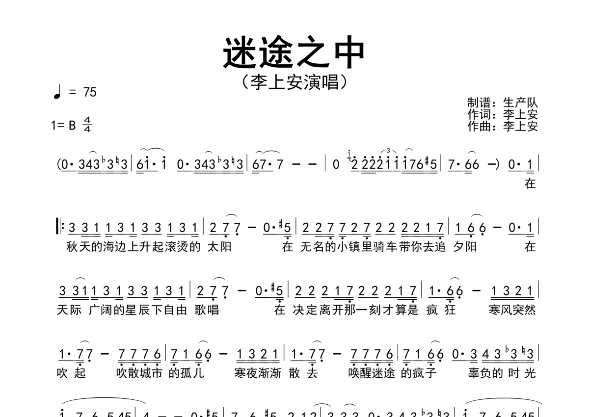 《迷途之中》是李上安演唱的一首歌曲,原版简谱,拍号为4/4拍,歌曲速度为每分钟75拍,这份简谱共有一张高清图谱,图谱由 @生产队 编配上传李上安演唱的歌曲《迷途之中》原版简谱。