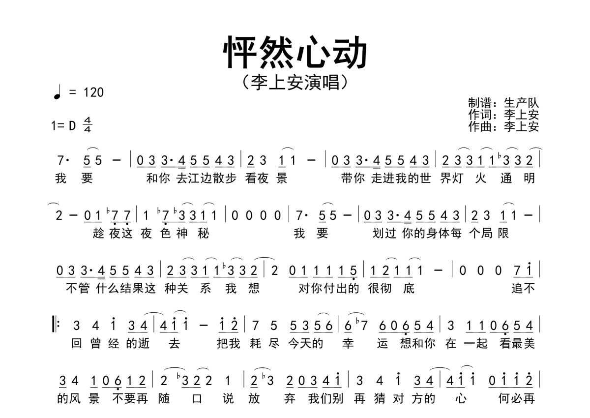 《怦然心动》是李上安演唱的一首歌曲,原版简谱,拍号为4/4拍,歌曲速度为每分钟120拍,这份简谱共有一张高清图谱,图谱由 @生产队 编配上传李上安演唱的歌曲《怦然心动》原版简谱。