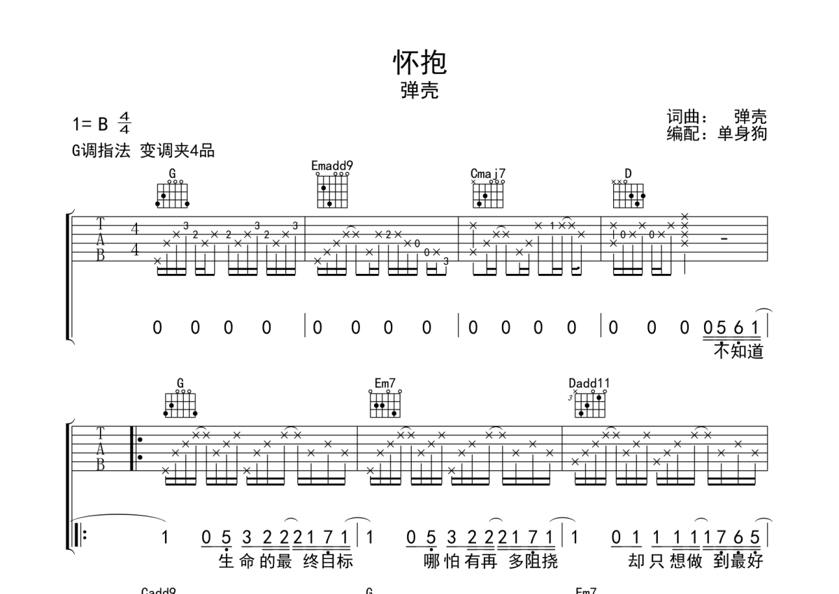 《怀抱》是弹壳演唱的一首歌曲,拍号为4/4拍,歌曲原调为B调,但由于原调指法比较难,为了方便弹奏,本吉他谱采用的是G调指法编配,变调夹4品弹奏即为原调,当然也可以根据自己的音域改变变调夹位置,或者通过改变和弦调性,以方便自己弹奏,这份吉他谱共有四张高清图谱,图谱由 @单身狗 编配上传,图谱使用六线谱编配,包含吉他和弦指法、简谱以及歌词部分,使用这份怀抱吉他谱,可以让你更加方便地掌握这首歌曲的弹唱技巧,快来尝试吧。