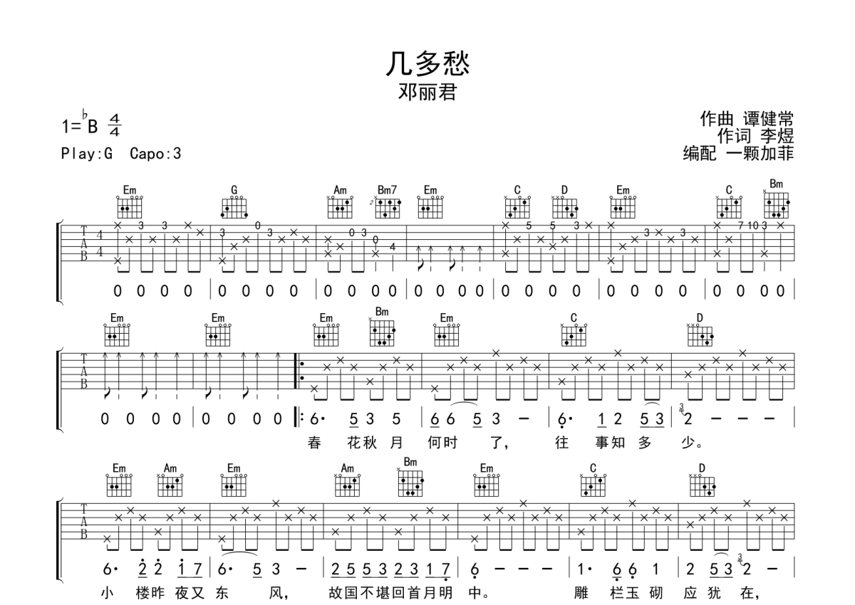 《几多愁》是邓丽君演唱的一首歌曲,拍号为4/4拍,歌曲原调为Bb调,但由于原调指法比较难,为了方便弹奏,本吉他谱采用的是G调指法编配,变调夹3品弹奏即为原调,当然也可以根据自己的音域改变变调夹位置,或者通过改变和弦调性,以方便自己弹奏,这份吉他谱共有两张高清图谱,图谱由 @一颗加菲 编配上传,图谱使用六线谱编配,包含吉他和弦指法、简谱以及歌词部分,曲谱配备了相关的音频提供试听,使用这份几多愁吉他谱,可以让你更加方便地掌握这首歌曲的弹唱技巧,快来尝试吧。