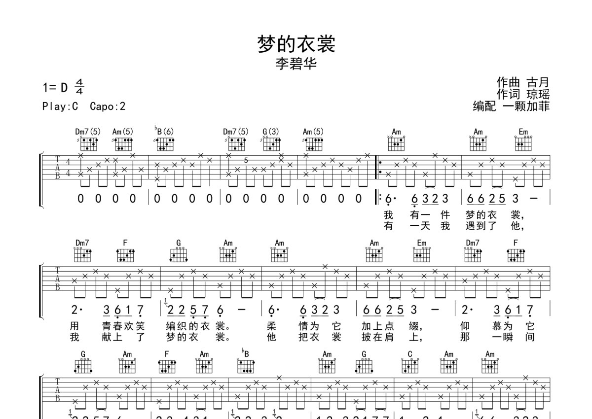 《梦的衣裳》是李碧华演唱的一首歌曲,拍号为4/4拍,歌曲原调为D调,但由于原调指法比较难,为了方便弹奏,本吉他谱采用的是C调指法编配,变调夹2品弹奏即为原调,当然也可以根据自己的音域改变变调夹位置,或者通过改变和弦调性,以方便自己弹奏,这份吉他谱共有两张高清图谱,图谱由 @一颗加菲 编配上传,图谱使用六线谱编配,包含吉他和弦指法、简谱以及歌词部分,曲谱配备了相关的音频提供试听,使用这份梦的衣裳吉他谱,可以让你更加方便地掌握这首歌曲的弹唱技巧,快来尝试吧。