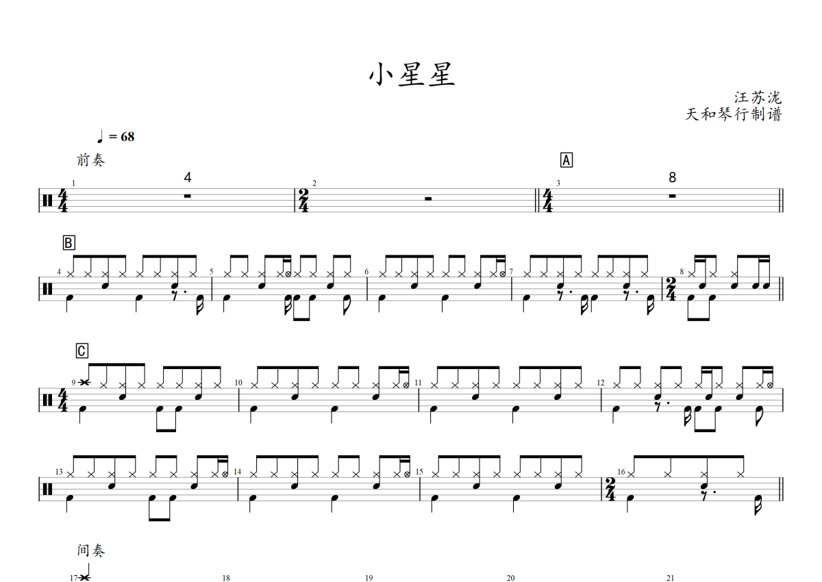 《小星星》是汪苏泷演唱的一首歌曲,拍号为4/4拍,歌曲速度为每分钟68拍,这份架子鼓谱共有两张高清图谱,图谱由 @音符喷血者 编配上传,图谱使用五线谱编配,使用这份小星星架子鼓谱,你将能够轻松地敲打出这首汪苏泷的小星星,快来尝试吧。