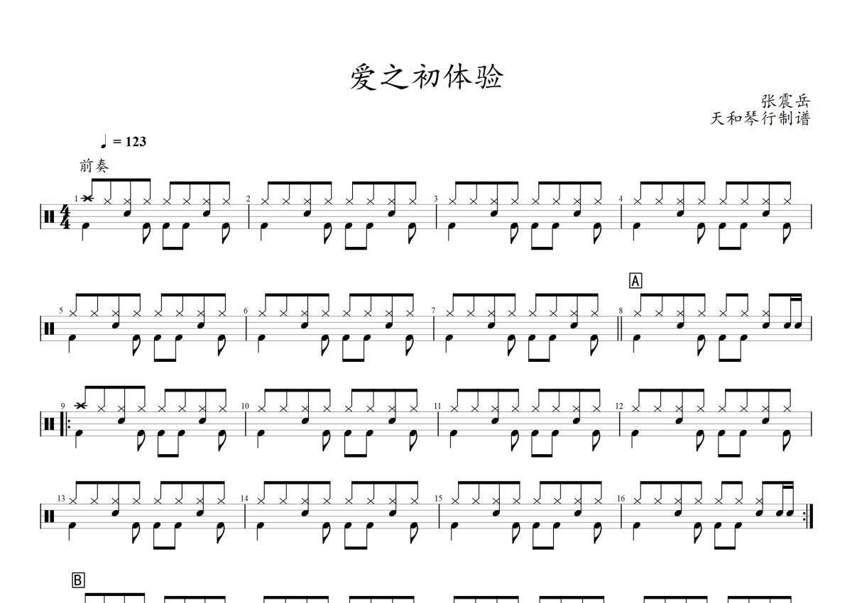 《爱的初体验》是张震岳演唱的一首歌曲,拍号为4/4拍,歌曲速度为每分钟123拍,这份架子鼓谱共有两张高清图谱,图谱由 @音符喷血者 编配上传,图谱使用五线谱编配,使用这份爱的初体验架子鼓谱,你将能够轻松地敲打出这首张震岳的爱的初体验,快来尝试吧。