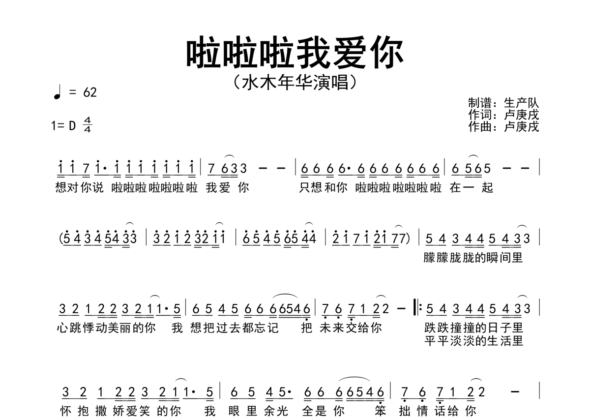 《啦啦啦我爱你》是水木年华演唱的一首歌曲,原版简谱,拍号为4/4拍,歌曲速度为每分钟62拍,这份简谱共有一张高清图谱,图谱由 @生产队 编配上传水木年华演唱的歌曲《啦啦啦我爱你》原版简谱。