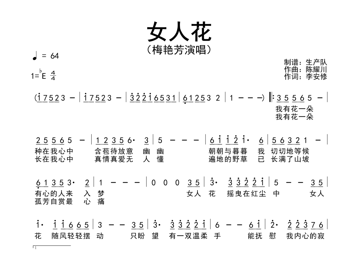 《女人花》是梅艳芳演唱的一首歌曲,原版简谱,拍号为4/4拍,歌曲速度为每分钟64拍,这份简谱共有一张高清图谱,图谱由 @生产队 编配上传梅艳芳演唱的歌曲《女人花》原版简谱。