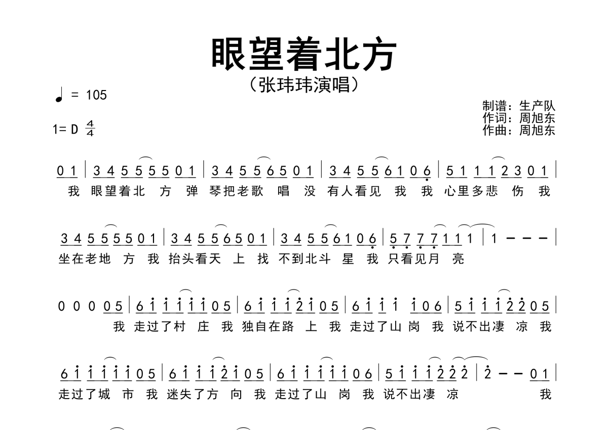 《眼望着北方》是张玮玮演唱的一首歌曲,原版简谱,拍号为4/4拍,歌曲速度为每分钟105拍,这份简谱共有一张高清图谱,图谱由 @生产队 编配上传张玮玮演唱的歌曲《眼望着北方》原版简谱。