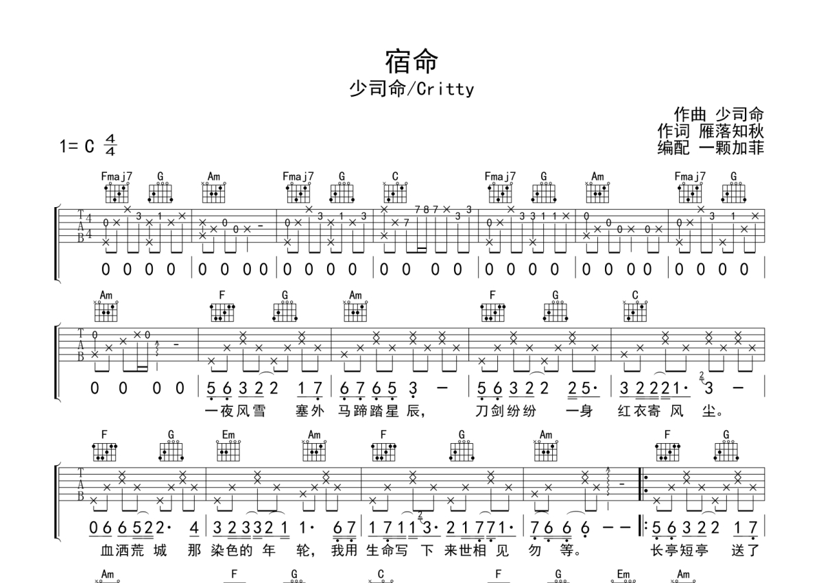 少司命《宿命》吉他谱 - C调弹唱六线谱
