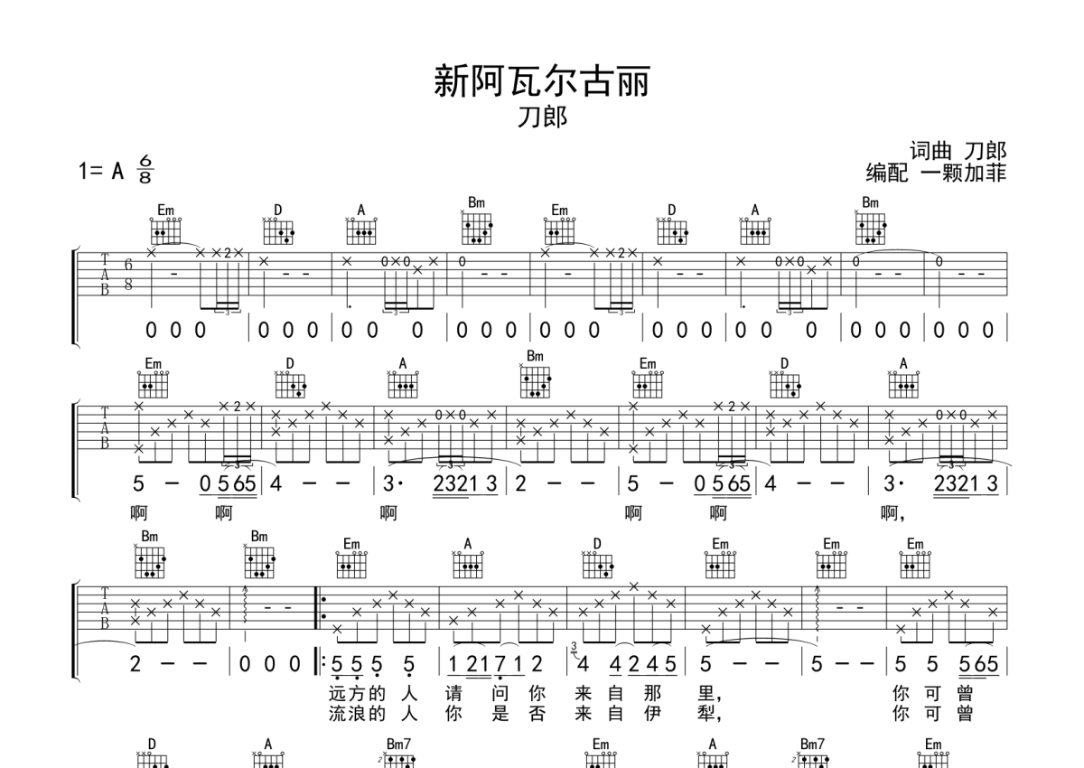 《新阿瓦尔古丽》是刀郎演唱的一首歌曲,拍号为6/8拍,歌曲原调为A调,但由于原调指法比较难,为了方便弹奏,本吉他谱采用的是G调指法编配,变调夹2品弹奏即为原调,当然也可以根据自己的音域改变变调夹位置,或者通过改变和弦调性,以方便自己弹奏,这份吉他谱共有两张高清图谱,图谱由 @一颗加菲 编配上传,图谱使用六线谱编配,包含吉他和弦指法、简谱以及歌词部分,曲谱配备了相关的音频提供试听,使用这份新阿瓦尔古丽吉他谱,可以让你更加方便地掌握这首歌曲的弹唱技巧,快来尝试吧。